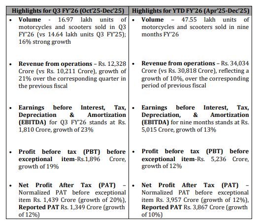 Hero MotoCorp, the world’s largest manufacturer of motorcycles and scooters, continues its strong financial performance for the third quarter (October – December 2025) of FY’26 and YTD FY’26 (April-December 2025), reporting highest ever Revenue & PAT.