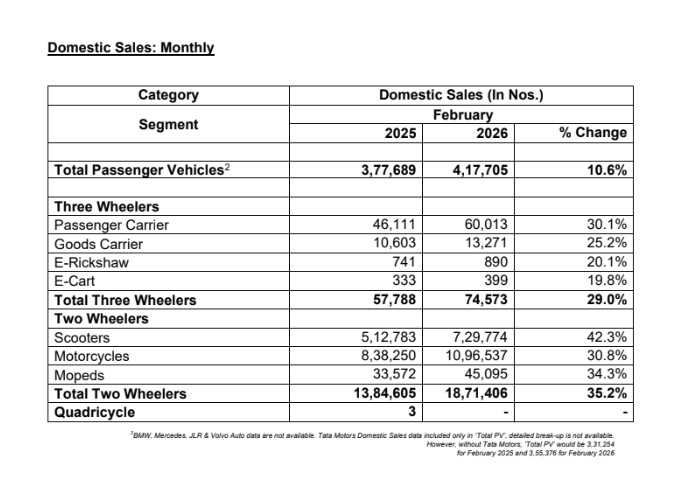 - Passenger Vehicles2 sales were 4,17,705 units in February 2026.